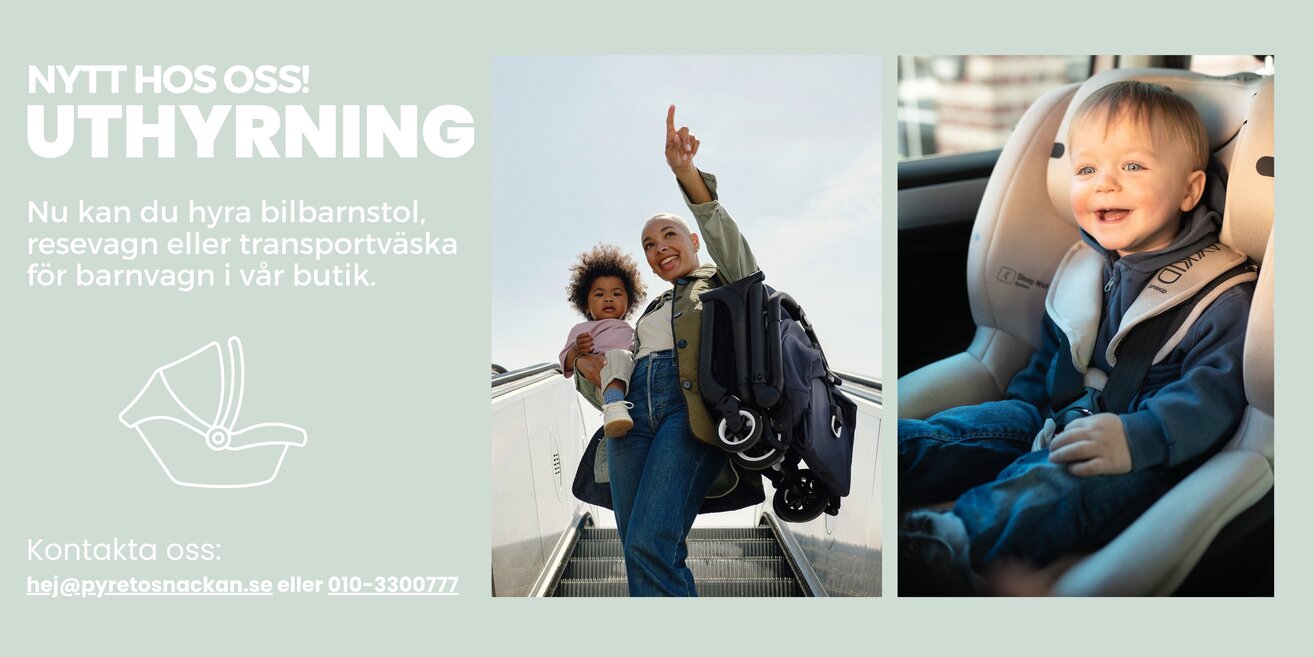 Hos Pyret & Snäckan i Staffanstorp kan du hyra bilbarnstol, resevagn eller transportväska för barnvagn. Kontakta oss via hej@pyretosnackan.se eller 010-3300777 för att boka & kontrollera tillgänglighet. Deposition: 1000:- tas ut (2500:- för bakåtvänd bilbarnstol) Montering av bilbarnstolen i er bil ingår i priset.
